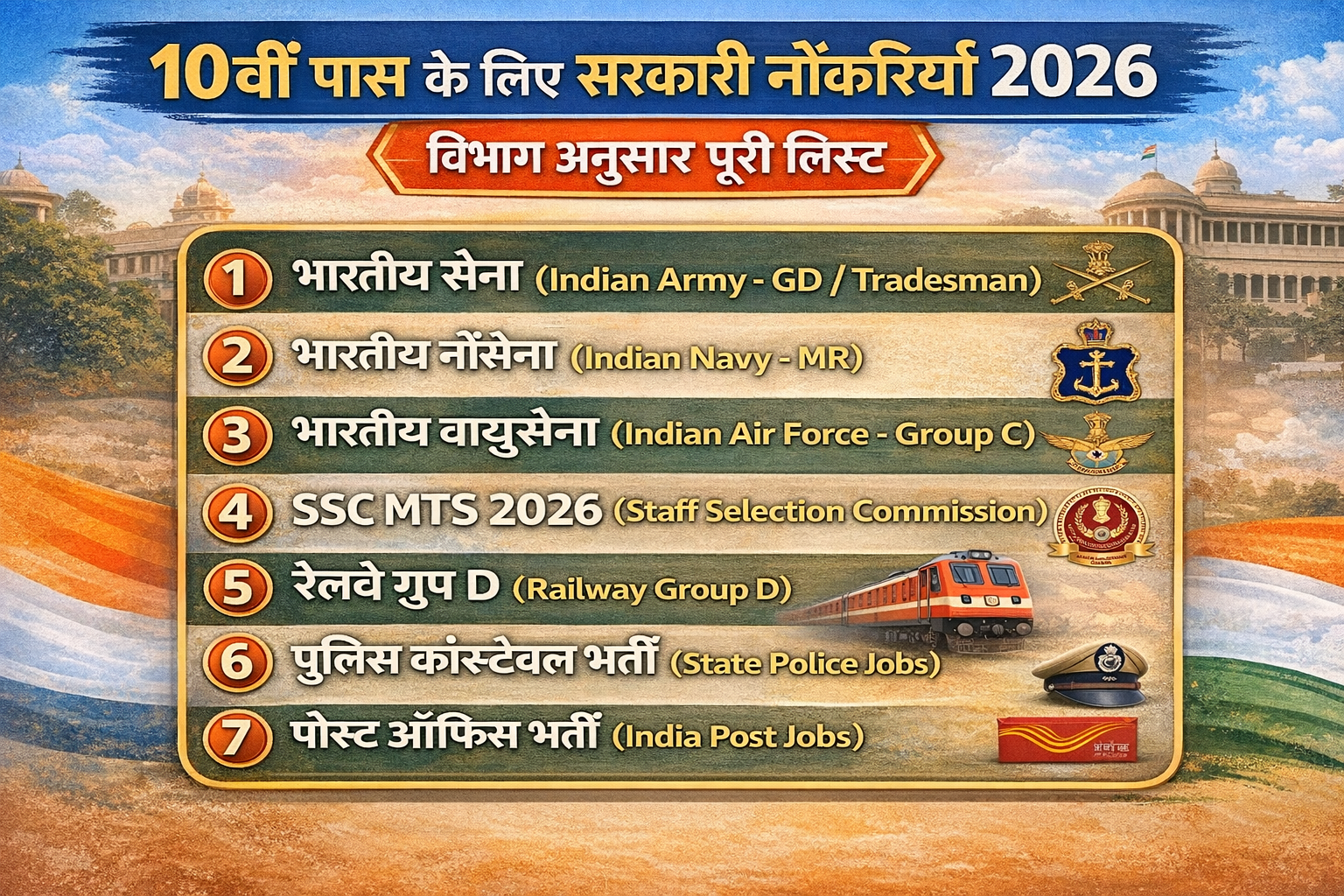 10वीं पास के लिए सरकारी नौकरियाँ 2026 – विभाग अनुसार पूरी लिस्ट10वीं पास के लिए सरकारी नौकरियाँ 2026 – भारतीय सेना, नौसेना, वायुसेना, SSC, रेलवे, पुलिस और पोस्ट ऑफिस भर्ती सूची 10th Pass Govt Jobs 2026 Apply Online