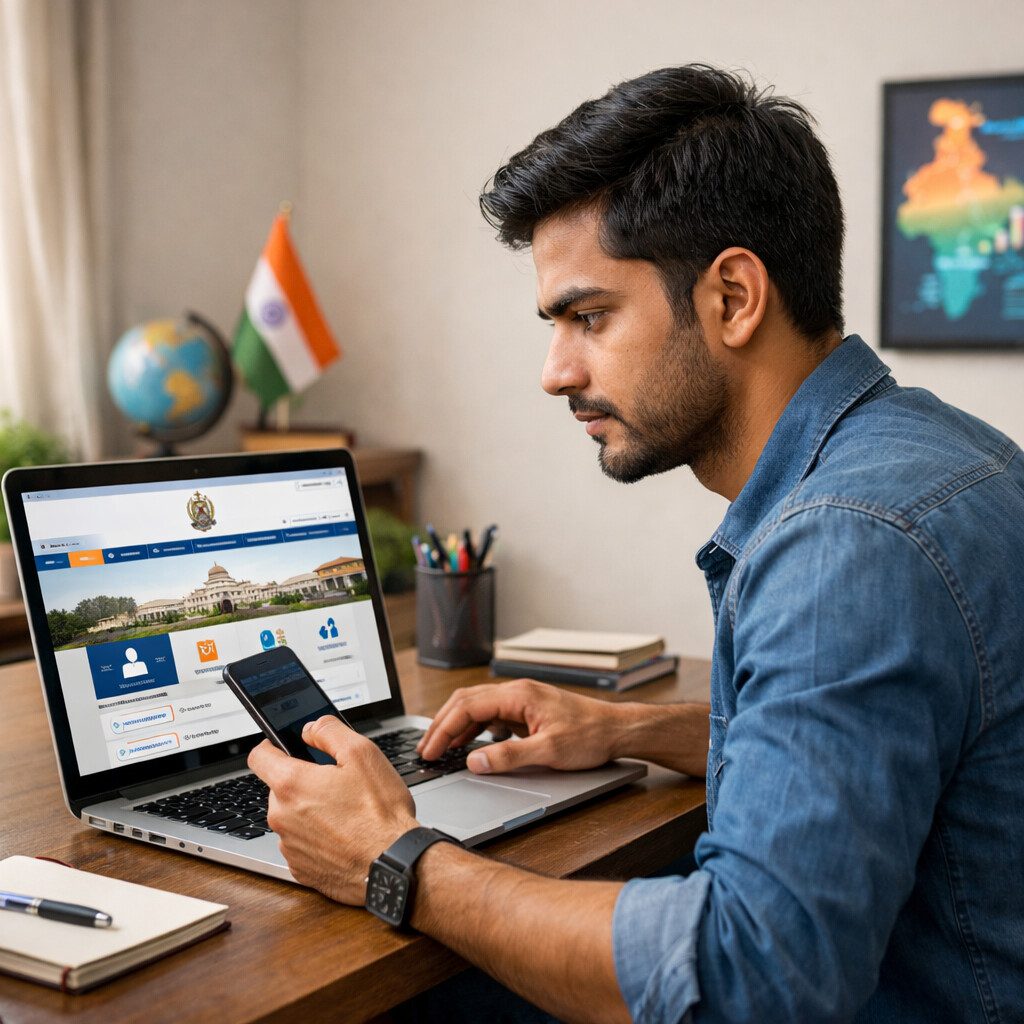 10वीं पास उम्मीदवारों के लिए तैयारी कैसे करेंसरकारी नौकरी के लिए ऑनलाइन आवेदन करता हुआ भारतीय युवा, लैपटॉप और मोबाइल फोन का उपयोग करते हुए, साधारण कमरे में केंद्रित भाव के साथ, डिजिटल इंडिया थीम 10th Pass Govt Jobs 2026 Apply Online