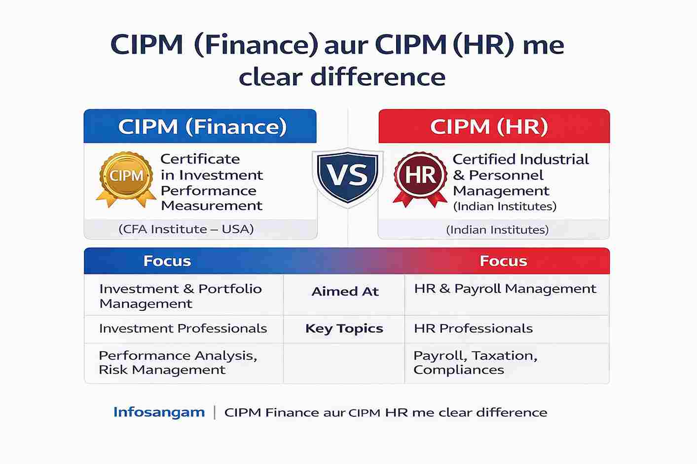 इस लेख में यह पूरी तरह स्पष्ट किया गया है कि Finance CIPM और HR CIPM दो बिल्कुल अलग courses हैं। Finance CIPM investment performance, portfolio analysis और global reporting standards पर आधारित है, जबकि HR CIPM human resource और labour law से जुड़ा होता है। दोनों का scope, recognition और career outcome अलग-अलग होता है, इसलिए सही course चुनना सबसे पहला और सबसे महत्वपूर्ण कदम है।
