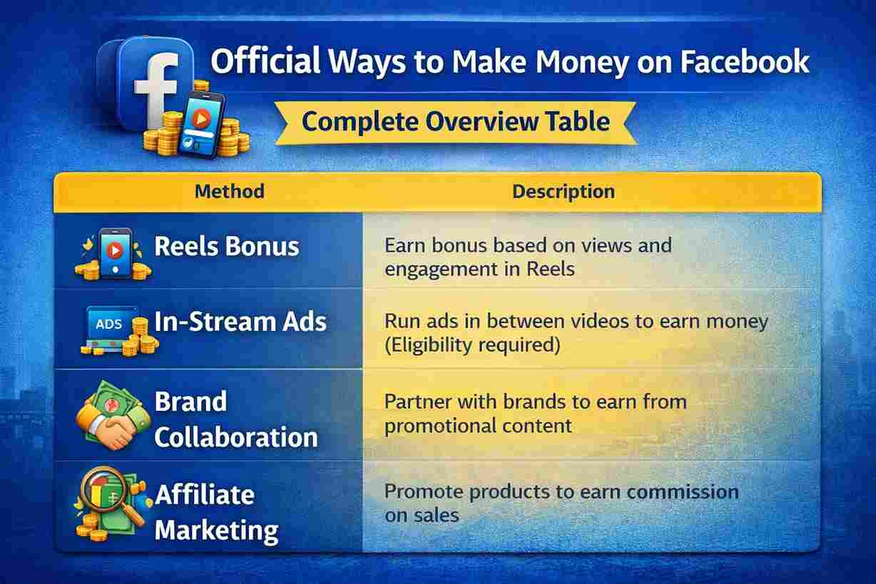 Facebook से कमाई के सभी Official तरीके Complete Overview Table